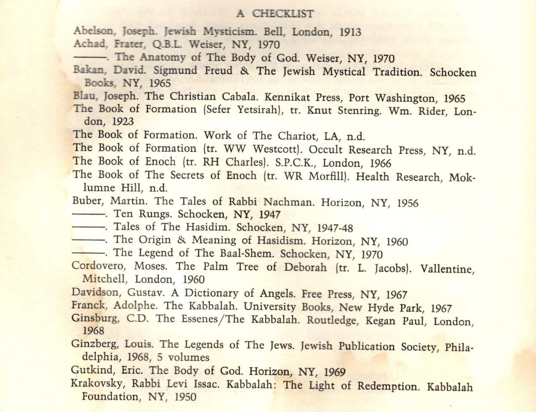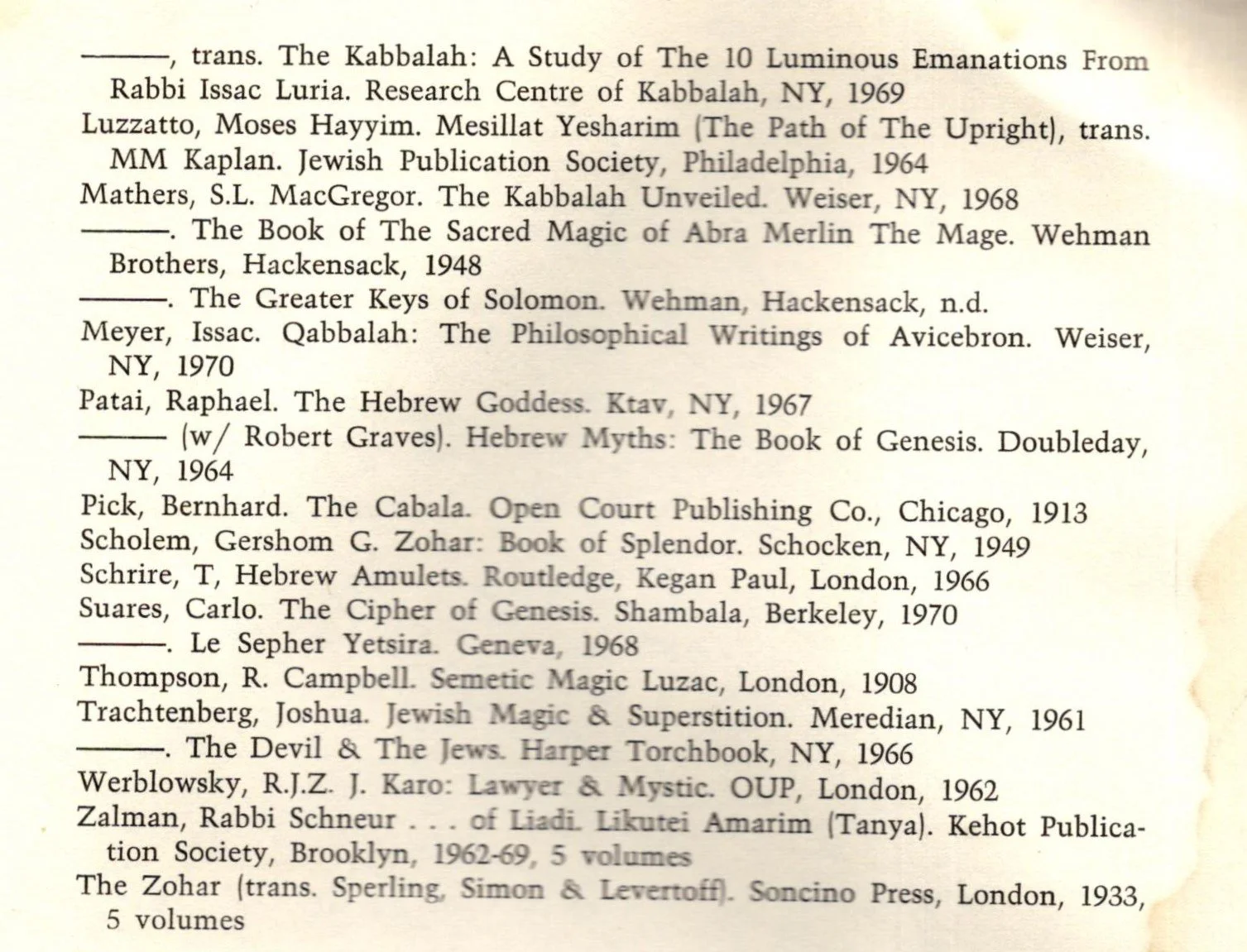 Thus, we see that Berman, the Jew, came to be introduced to Jewish mysticism by non-Jews, and the Hebrew language through books in English. At the end of the first issue of Tree, a poetry journal edited by David Meltzer [Tree: 1, Winter 1970], following a section devoted to Abraham ben Samuel Abulafia, Melzer provides “A Checklist.” It is unclear whether he wants it to be a useful bibliography for the contents of the entire issue or just the Abulafia section. [Images of this list are reproduced below.] What we see in the list is a fairly comprehensive list of the books on Jewish mysticism available in English in 1970. Along with works by Buber, Scholem, Moses Hayyim Luzzatto, Louis Ginsburg and Raphael Patai and many books published by iffier authors like Carlos Suares and S.L. Mathers. The English version of the Zohar was known to be poor. The Daniel Matt translation of the Zohar exists precisely because of how awful the earlier (and first English language) translation was. (The issue of Tree also opens with a page reproducing, on its own, Berman’s aleph).