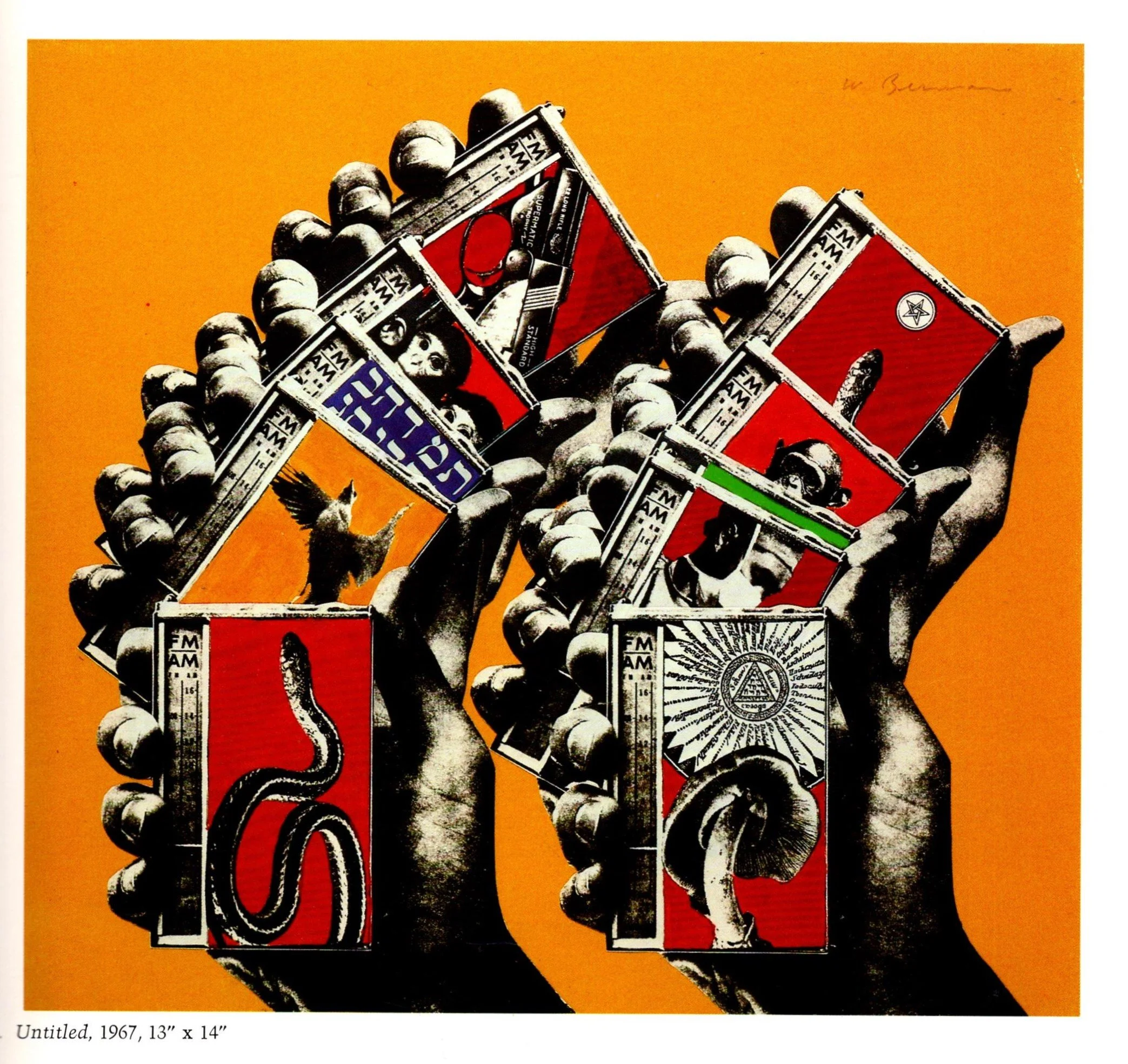“Berman adopted another such symbol of wholeness, the first letter of the Hebrew alphabet, aleph, as his personal signet. Scholem points out that the aleph is a silent consonant that ‘represents nothing more than the position taken by the larynx when a word begins with a vowel.’ Aleph is the silent source of all articulation, the seed of the entire alphabet, ‘and indeed the Kabbalists regarded it as the spiritual root of all other letters.’ Berman stamped the aleph everywhere, from his motorcycle helmet to ‘Semina 7,’ entitled “ALEPH,” which is an entire issue of photography, drawings and writing by Berman dominated by the letter aleph. Speaking of Berman’’s collages and assemblages, Meltzer notes how the aleph functions in relation to the mundane imagery drawn from print sources: ‘Above the triteness and everydayness of this image continuum was Aleph – the first letter of the Hebrew alphabet, which put everything into a strange tension, because on the one hand you’d see the normative images that newspapers and magazines use to increase circulation held at bay by this letter.’” [Semina Culture: Wallace Berman & His Circle].